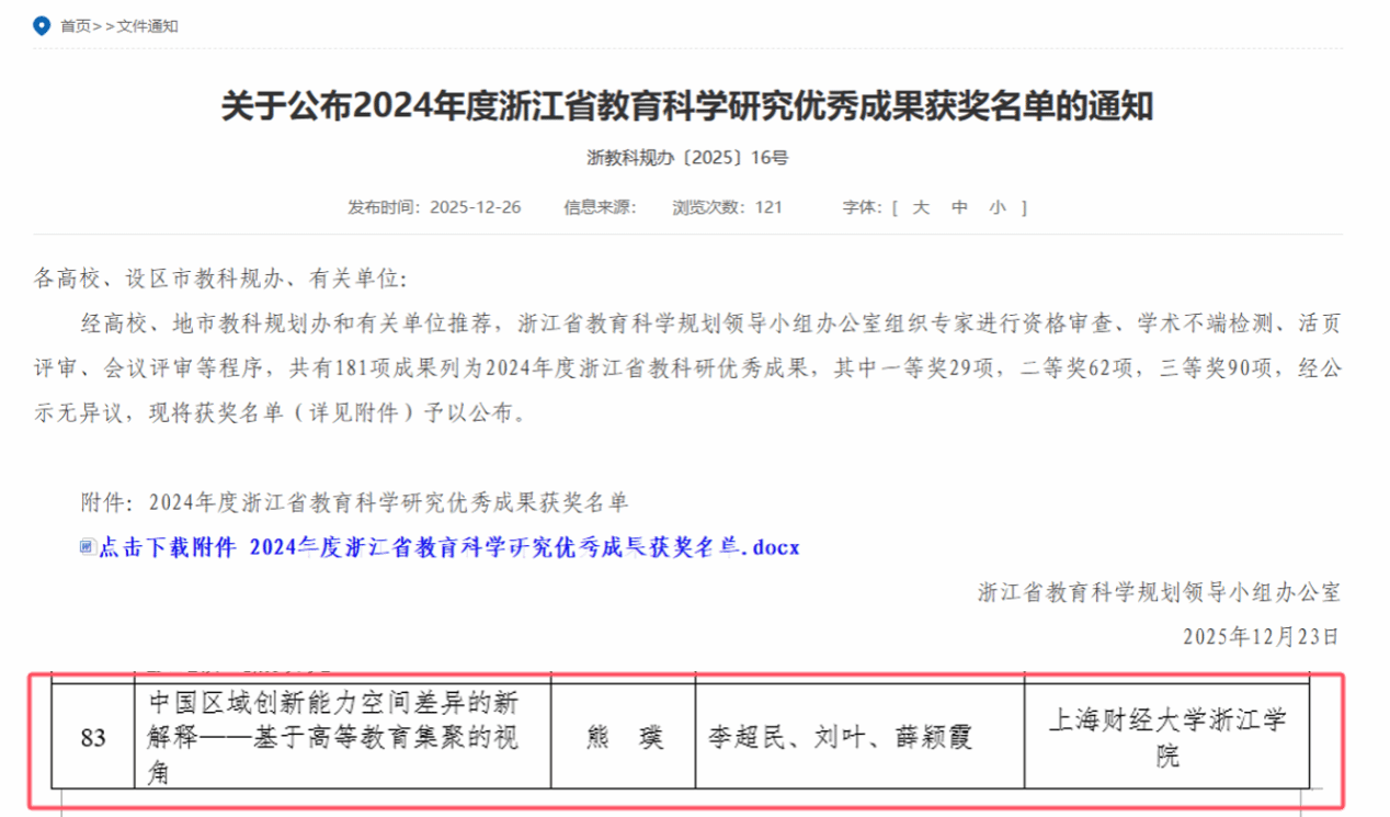 12月26日,浙江省教育科学规划领导小组办公室正式公布2024年度浙江省教育科学研究优秀成果获奖名单,亚博取款快速到账,华体会网页版登录入口,ob视讯体育官网工商管理系熊璞老师的研究成果《中国区域创新能力空间差异的新解释——基于高等教育集聚的视角》凭借扎实的研究功底、新颖的研究视角及重要的实践价值荣获三等奖。
